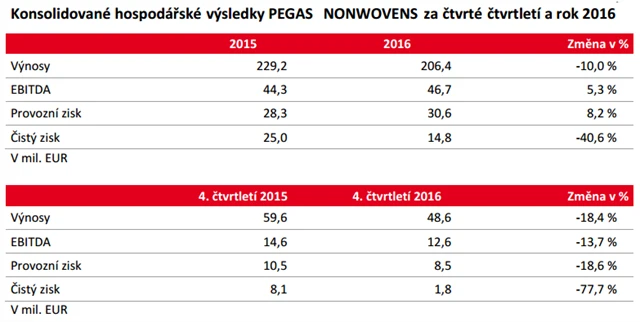 Pegas Nonwovens, přední evropský výrobce netkaných textilií, dosáhl na základě neauditovaných výsledků v roce 2016 celkových konsolidovaných výnosů 206,4 milionu EUR. Ve čtvrtém čtvrtletí 2016 dosáhly konsolidované výnosy 48,6 milionu EUR (meziročně -18,4 %). Pokles tržeb souvisel s vývojem cen polymerů, které oproti předchozímu roku zaznamenaly více než 10% propad.