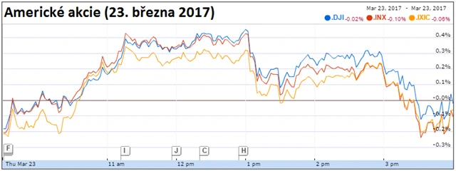 Americké akcie ve čtvrtek mírně oslabily kvůli obavám z průtahů při schvalování reformy zdravotní péče. Ta je považována za první test schopnosti Donalda Trumpa prosazovat svou politiku v Kongresu.