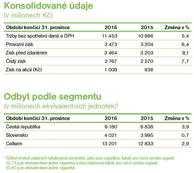 Společnost ve výsledkové zprávě dále připomněla, že v České republice byla od 1. ledna 2017 pevná (specifická) část spotřební daně zvýšena o 30 Kč na 1 420 Kč za tisíc cigaret a od 1. ledna 2018 bude zvýšena o dalších 40 Kč na 1 460 Kč za tisíc cigaret. Minimální spotřební daň na cigarety vzrostla o 50 Kč na 2 570 Kč na 1 000 cigaret v roce 2017 a bude zvýšena o dalších 60 Kč na 2 630 Kč za tisíc cigaret v roce 2018. Valorická složka se v porovnání s rokem 2016 (v současnosti 27 %) v letech 2017 a 2018 nezmění. Zvýšení spotřební daně v letech 2017 a 2018 se týká též doutníků, cigarillos a jemně řezaného tabáku. Spotřební daň z jemně řezaného tabáku vzrostla na 2 185 Kč za 1 kg v roce 2017 a bude dále zvýšena na 2 236 Kč za 1 kg v roce 2018.