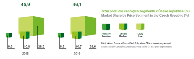 Philip Morris ČR - tržní podíl dle cenových segmentů v ČR (2016)