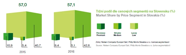 Philip Morris Slovakia - tržní podíl dle cenových segmentů na Slovensku (2016)