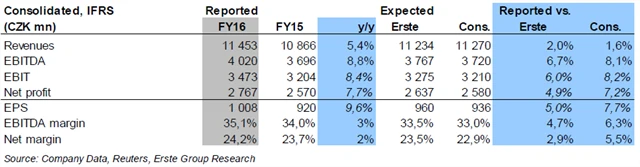 Philip Morris ČR - Reportované výsledky za rok 2016 vs. odhady Erste