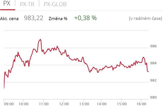 Pražská burza se v úterý odrazila od pondělní ztráty, když index PX zpevnil o 0,38 % na 983,22 bodu. Nahoru burzu táhly akcie polostátní společnosti ČEZ a tabákové firmy Philip Morris ČR, výrazně naopak ztratila pojišťovna VIG. Objem obchodů byl s 579 miliony korun podprůměrný.