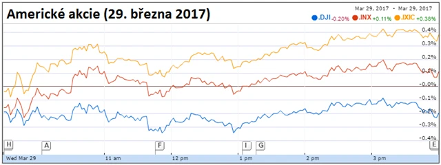 Index Dow klesl o 0,2 % na 20 659,32 bodu, širší index S&P 500 ale stoupl o 0,11 % na 2 361,13 bodu a index technologického trhu Nasdaq Composite se zvýšil o 0,38 % na 5 897,55 bodu. Index volatility VIX klesl o 0,95 % na 11,42 bodu a výnos 10letých vládních dluhopisů USA se snížil o čtyři bazické body na 2,378 %.