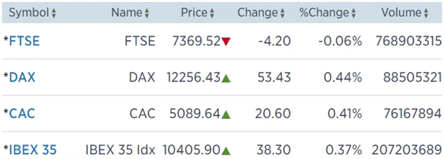Britský FTSE 100 ztratil 0,06 % na 7 369,52 bodu, a šel tak proti trendu. Francouzský CAC 40 vzrostl o 0,41 % na 5 089,64 bodu a německý index DAX si polepšil o 0,44 % na 12 256,43 bodu.