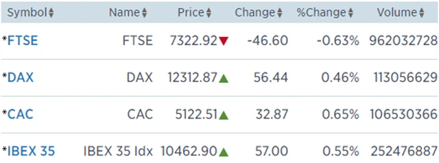 Britský FTSE 100 šel proti trendu, když ztratil 0,63 % na 7 322,92 bodu (týden: +0,07 %, měsíc: -0,43 %, 1Q2017: +2,79 %), francouzský CAC 40 si polepšil o 0,65 % na 5 122,51 bodu (týden: +2,02 %, měsíc: +2,55 %, 1Q2017: +5,35 %) a německý DAX vzrostl o 0,46 % na 12 312,87 bodu (týden: +2,06 %, měsíc: +2,37 %, 1Q2017: +7,25 %).