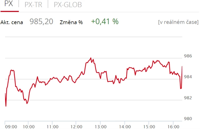 Pražská burza začala nový týden v zelených číslech, index PX stoupl o 0,41 % na 985,20 bodu. Nahoru burzu táhly akcie Komerční banky a petrochemického holdingu Unipetrol, nedařilo se sázkařské společnosti Fortuna. Objem obchodů byl s 398 miliony korun podprůměrný.