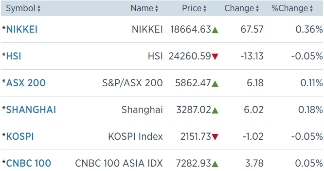 Australský S&P/ASX 200 si připsal 0,11 %, čínské akcie uzavřely smíšeně. Shanghai Composite zpevnil o 0,18 %, menší Shenzhen Composite však o 0,04 % přišel. Hongkongský Hang Seng klesl o 0,05 %.