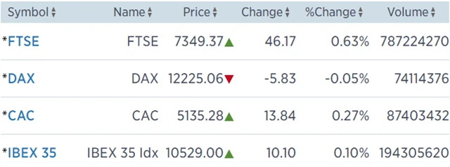 Širší západoevropský akciový index STOXX Europe 600 stoupl o 0,13 % na 381,26 bodu, za celý týden si připsal 0,03 %. Index londýnské burzy FTSE 100 zpevnil o 0,63 % na 7 349,37 bodu (za celý týden +0,31 %) a francouzský CAC 40 vzrostl o 0,27 % na 5 135,28 bodu (za celý týden +0,13 %). Německý index DAX v pátek klesl o 0,05 % na 12 225,06 bodu (za celý týden -0,71 %).
