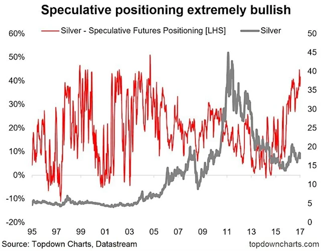 Z pohledu na graf je i přes propad ceny stříbra po roce 2011 patrný mírně vzestupný trend, který začíná rokem 2005, zajímavější je ale graf spekulativních futures pozic na stříbře, který nyní, stejně jako v letech 2009 a 2010, může naznačovat blížící se býčí trh.