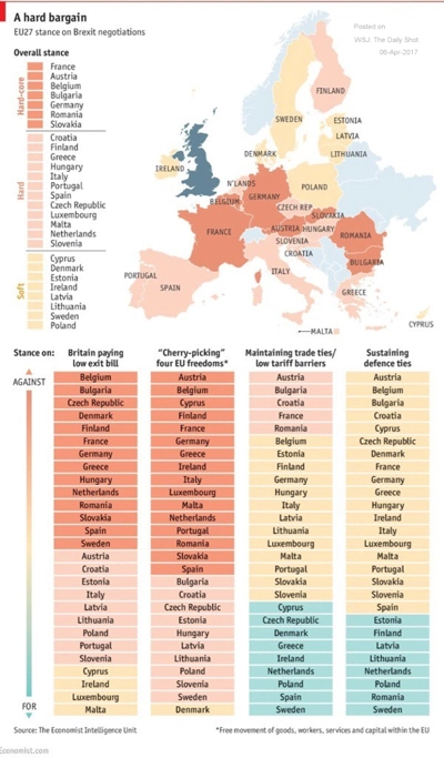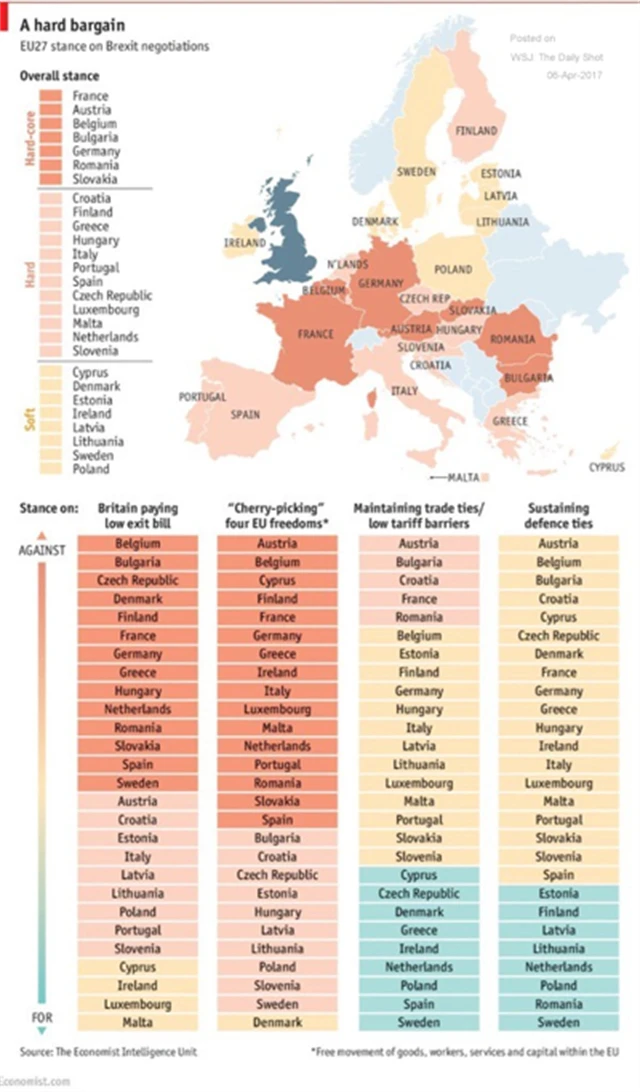 Na konci března britská premiérka Theresa Mayová aktivovala článek 50, a oficiálně tak zahájila jednání o vystoupení Spojeného království z Evropské unie. Podle unijních smluv tedy odstartovalo dvouleté vyjednávání, které by v ideálním případě mělo obě strany co nejméně bolet. Z pohledu na níže uvedený diagram však dosažení shody mezi všemi státy EU rozhodně nebude růžovou procházkou.