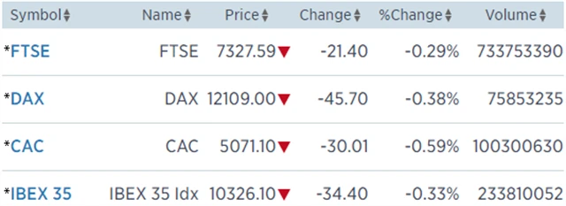 Regionální index STOXX Europe 600 ve čtvrtek klesl o 0,35 % na 380,38 bodu, za celý týden pak ztratil 0,18 %. Britský FTSE 100 odepsal 0,29 % na 7 327,59 bodu (za celý týden -0,32 %), francouzský CAC 40 spadl o 0,59 % na 5 071,10 bodu (za celý týden -1,21 %) a německý DAX odevzdal 0,38 % na 12 109 bodů (za celý týden -0,95 %). Kvůli velikonočním svátkům se evropské burzy znovu otevřou až v úterý.