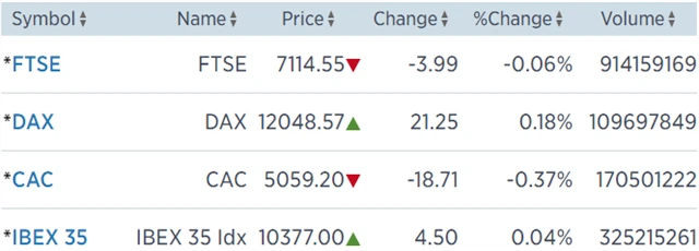 Regionální index STOXX Europe 600 v pátek stoupl o 0,02 % na 378,12 bodu, za celý týden však 0,65 % odepsal. Britský FTSE 100 přišel o 0,06 % na 7 114,55 bodu (za celý týden -2,84 %), francouzský CAC 40 odevzdal 0,37 % na 5 059,20 bodu (za celý týden -0,08 %) a německý DAX si připsal 0,18 % na 12 048,57 bodu (za celý týden -0,5 %).