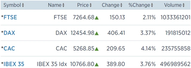 Regionální index STOXX Europe 600 vzrostl o 2,11 % na 386,09 bodu a během seance se dostal nejvýše od prosince 2015. Francouzský CAC 40 dosáhl devítiletého maxima 5 295,47 bodu a uzavřel se ziskem 4,14 % na 5 268,85 bodu. Německý index DAX vytvořil nový intradenní rekord 12 456,18 bodu, obchodování zakončil 3,37 % v plusu na 12 454,98 bodu. Britský FTSE 100 si pak připsal 2,11 % na 7 264,68 bodu.