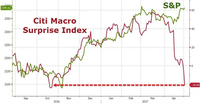 Americké akcie v posledních měsících nezadržitelně rostou a většina investorů se nechává unášet představou, že daňová reforma Donalda Trumpa je vystřelí ještě výše. Skeptici však očekávají korekci trhu a do karet jim nahrává vývoj indexu ekonomického překvapení Citigroup (Citigroup Economic Surprise Index - CESI), který v posledních dnech výrazně klesal a v pondělí se propadl dokonce na nejnižší hodnotu od října 2016.