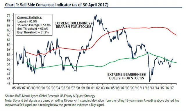 Tomu nahrává i graf nálady na trzích od Bank of America Merrill Lynch. Ten sice vystoupil na 20měsíční maximum a posunul se dále do neutrálního pásma, v němž se drží již pět měsíců, analytici banky však upozorňují, že růst optimismu může vést k tržní eufórii, která je typická na konci býčího trendu.
