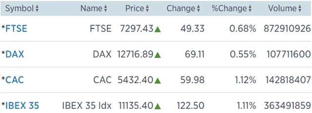 Britský FTSE 100 vzrostl o 0,68 % na 7 297,43 bodu (za celý týden +1,12 %), francouzský CAC 40 si polepšil o 1,12 % na 5 432,4 bodu (za celý týden +2,92 %) a německý DAX stoupl o 0,55 % na 12 716,89 bodu (za celý týden +2,24 %). Index CAC 40 se dostal nejvýše od ledna 2008.