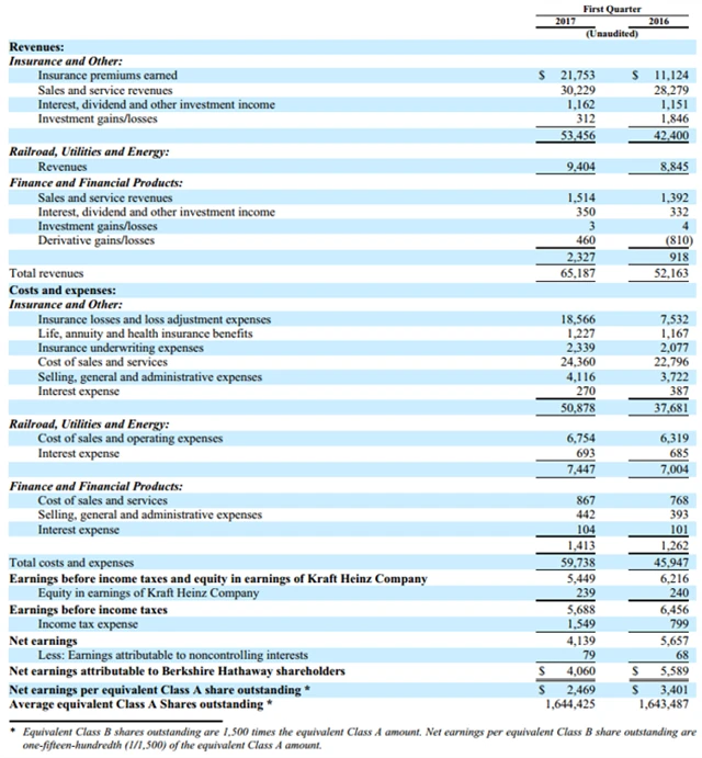 Čistý zisk investičního konglomerátu Berkshire Hathaway, výkladní skříně multimiliardáře Warrena Buffetta, v prvním letošním čtvrtletí klesl na 4,06 miliardy USD z 5,59 miliardy USD před rokem. V přepočtu na akcii firma vydělala 2 469 USD, trh čekal 2 674 USD.