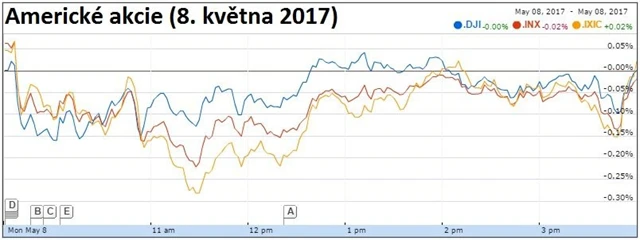 Index volatility VIX sestoupil na nejnižší úroveň od roku 1993 poté, co v druhém kole prezidentských voleb ve Francii liberál Emmanuel Macron porazil krajně pravicovou političku Marine Le Penovou. Po konci seance se VIX ustálil na hladině 9,77 bodu (-7,57 %). Výnos 10letých amerických vládních dluhopisů se zvýšil o téměř čtyři bazické body na 2,386 %.