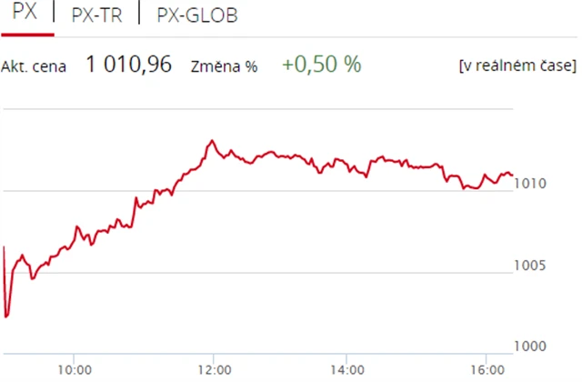 Pražská burza v první seanci zkráceného týdne uzavřela v zelených číslech, index PX stoupl o 0,5 % na 1 010,96 bodu. Index PX-TR, který je očištěný o dividendy, vzrostl o 0,95 % na 1 671,55 bodu. Nahoru burzu táhly finanční tituly, výrazně se naopak propadly akcie telefonního operátora O2 Czech Republic, které se v úterý obchodovaly poprvé bez nároku na dividendu ve výši 21 Kč včetně části z rozpouštěného emisního ážia (4 Kč na akcii). Objem obchodů byl s 857 miliony korun nadprůměrný.