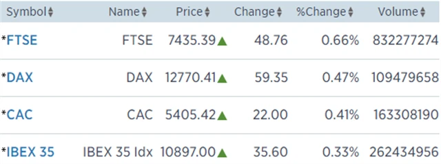 Britský index FTSE 100 si polepšil o 0,66 % na 7 435,39 bodu (za celý týden +1,8 %), francouzský CAC 40 zpevnil o 0,41 % na 5 405,42 bodu (za celý týden -0,5 %) a německý DAX vzrostl o 0,47 % na 12 770,41 bodu (za celý týden +0,42 %).