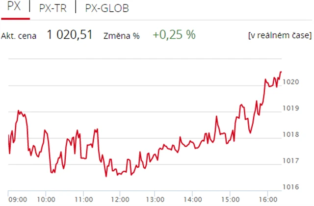 Pražská burza v úvodu nového týdne uzavřela v zelených číslech, když index PX stoupl o 0,25 % na 1 020,51 bodu. Nahoru ji táhly akcie Erste Group Bank a Philip Morris ČR, nedařilo se naopak sázkařské společnosti Fortuna. Objem obchodů byl s 467 miliony korun podprůměrný.