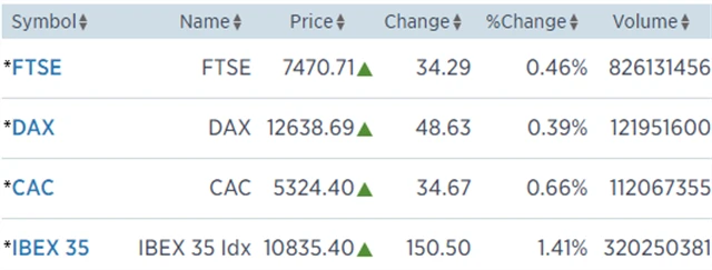 Regionální index STOXX Europe 600 zpevnil o 0,6 % na 391,51 bodu, když v plusu seanci zakončily všechny jeho sektory. Za celý týden ale klesl o 1,04 %. Britský FTSE 100 vzrostl o 0,46 % na 7 470,71 bodu (za celý týden +0,4 %), francouzský CAC 40 si připsal 0,66 % na 5 324,4 bodu (za celý týden -1,5 %) a německý DAX stoupl o 0,39 % na 12 638,69 bodu (za celý týden -1,03 %).