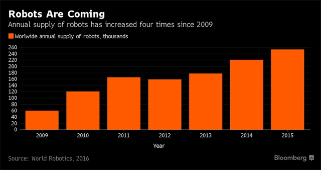 Ve Spojených státech, Německu a Japonsku se výrazným tempem zvyšuje počet automatizovaných výrobních linek a zanedlouho by tento trend měl dorazit i do méně vyspělých ekonomik. Z českého pohledu je zajímavý fakt, že podle agentury Bloomberg by Česká republika měla být jednou ze zemí, které jsou nástupem robotizace nejvíce ohroženy.
