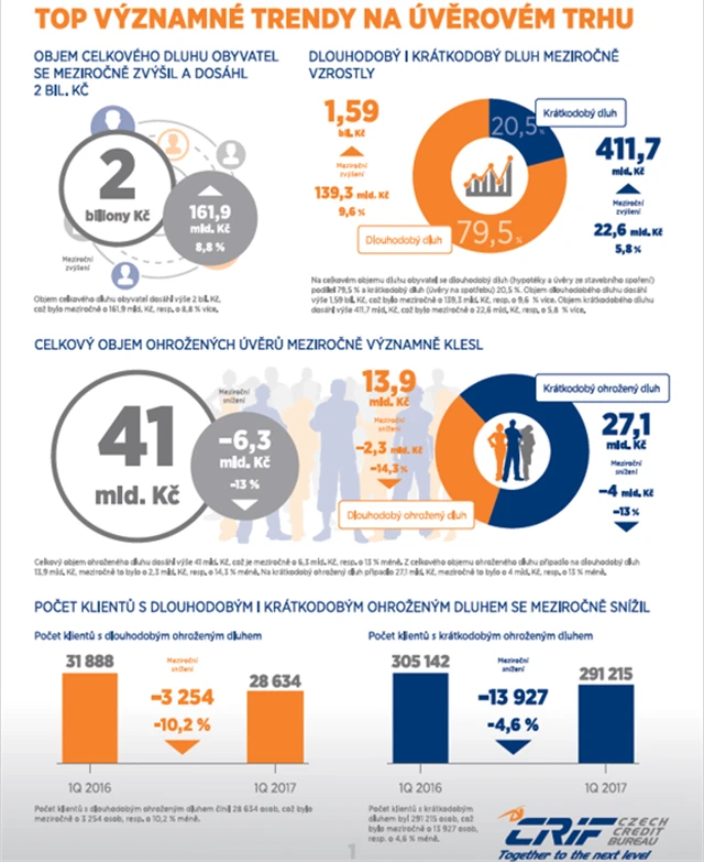 Počet klientů s dluhem se meziročně snížil o 27 000 na 3,03 milionu. Za úbytkem stojí především meziroční pokles klientů s krátkodobým dluhem o 35 000 na 2,42 milionu. Počet klientů s dlouhodobým dluhem naopak o 5 000 vzrostl a dosáhl 1,12 milionu.