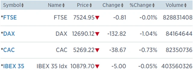 Britský FTSE 100 přišel pouze o 0,01 % na 7 524,95 bodu, francouzský CAC 40 se snížil o 0,73 % na 5 269,22 bodu a německý index DAX klesl o 1,04 % na 12 690,12 bodu.