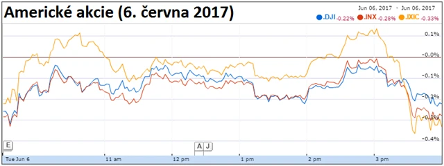 Index Dow klesl o 0,23 % na 21 136,23 bodu, širší S&P 500 se snížil o 0,28 % na 2 429,33 bodu a index technologického trhu Nasdaq Composite uzavřel se ztrátou 0,33 % na 6 275,06 bodu. Index volatility VIX se zvýšil o 3,77 % na 10,45 bodu a výnos 10letých vládních dluhopisů USA se snížil o téměř čtyři bazické body na 2,143 %.