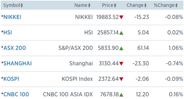 Japonský Nikkei 225 ztratil 0,08 %, jihokorejský Kospi přišel o 0,09 %, australský S&P/ASX 200 naopak zpevnil o 1,06 %, když jej nahoru táhl zejména sektor zdravotní péče.