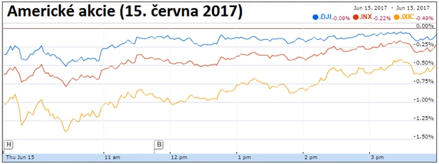 Index Dow skončil se ztrátou 0,07 % na 21 359,90 bodu, širší S&P 500 klesl o 0,22 % na 2 432,46 bodu a index technologického trhu Nasdaq Composite uzavřel se ztrátou 0,47 % na 6 165,50 bodu. Index volatility VIX se zvýšil o 2,44 % na 10,90 bodu a výnos 10letých vládních dluhopisů USA stoupl o tři a půl bazického bodu na 2,162 %.