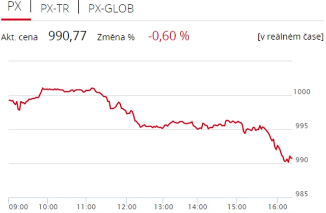 Pražská burza v pátek prohloubila ztráty z předchozích seancí, index PX přišel o 0,6 % na 990,77 bodu. Dolů burzu táhly akcie Komerční banky, Monety Money Bank, operátora O2 Czech Republic a energetické skupiny ČEZ. Dařilo se naopak pojišťovně VIG, tabákové firmě Philip Morris ČR a sázkařské společnosti Fortuna. Objem obchodů byl s 1,285 miliardy korun výrazně nadprůměrný, což bylo způsobeno rebalancováním indexů CECE a PX.