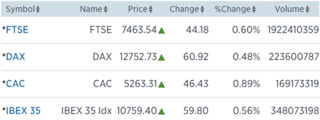 Regionální index STOXX Europe 600 zpevnil o 0,66 % na 388,60 bodu, za celý týden všakl klesl o 0,46 %. Britský FSTE 100 stoupl o 0,6 % na 7 463,54 bodu (za celý týden -0,95 %), francouzský CAC 40 si polepšil o 0,89 % na 5 263,31 bodu (za celý týden -0,69 %) a německý DAX vzrostl o 0,48 % na 12 52,73 bodu (za celý týden -0,49 %).