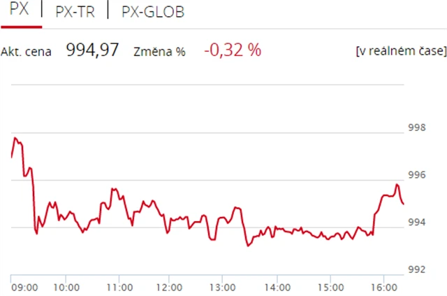 Pražská burza ve středu prohloubila ztrátu z úterní seance, když index PX odepsal 0,32 % na 994,97 bodu. Dolů burzu táhly akcie Komerční banky, Monety Money Bank a telefonního operátora O2 Czech Republic, dařilo se naopak tabákové firmě Philip Morris ČR a sázkařské společnosti Fortuna. Objem obchodů byl s 512 miliony korun podprůměrný.
