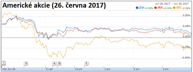 Index Dow si připsal 0,07 % a uzavřel na 21 409,55 bodu a širší index S&P 500 se zvýšil o 0,03 % na 2 439,07 bodu, zatímco index technologického trhu Nasdaq Composite klesl o 0,29 % na 6 247,15 bodu. Index volatility VIX klesl o 1,2 % na 9,9 bodu a výnos 10letých vládních dluhopisů USA se snížil o jeden bazický bod na 2,134 %.