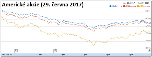 Index Dow klesl o 0,78 % na 21 287,03 bodu, širší S&P 500 oslabil o 0,86 % na 2 419,70 bodu a index technologickému trhu Nasdaq Composite se snížil o 1,44 % na 6 144,35 bodu. Index volatility VIX vyskočil o 14,06 % na 11,44 bodu a výnos 10letých vládních dluhopisů USA se zvýšil o tři a půl bazického bodu na 2,265 %.