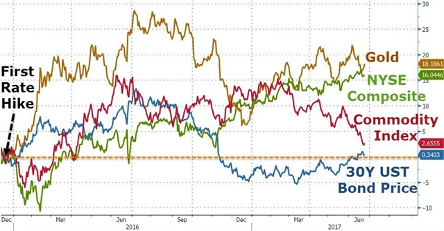 Jeden a půl roku od začátku současného cyklu zvyšování úrokových sazeb americkým Fedem je nejvýkonnějším aktivem stále zlato. Od 15. prosince 2015 cena zlata stoupla o 18 % na současných 1 244 USD za trojskou unci. Zlato tak za sebou nechalo jak americké akcie, tak komodity, které naopak v poslední době umazávají předešlé zisky. Zlato podle analytiků těží z obav, že akciové trhy v blízké budoucnosti čeká kolaps kvůli extrémně vysokým valuacím, stejně jako ze spekulací, že Fed bude dále zvyšovat úrokové sazby už jen velmi pomalým tempem. Na tento rok je naplánované ještě jedno utažení měnové politiky.