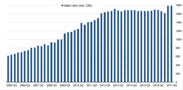 Státní dluh Česka zůstal na konci letošního druhého čtvrtletí oproti březnu prakticky beze změn, a to na historickém maximu zhruba 1,789 bilionu korun. Oproti hodnotě ze závěru roku 2016 je tak dluh vlády vyšší o zhruba 176 miliard korun, uvedl ekonom Komerční banky Marek Dřímal.