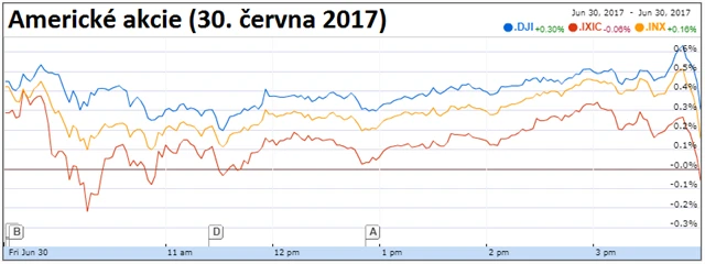 Americké akcie v závěru týdne mírně posílily. Páteční seance navíc uzavřela také první pololetí, které bylo pro indexy Dow Jones a S&P 500 nejlepší od roku 2013. Dolar v pátek mírně ožil, přesto však vykázal nejprudší čtvrtletní pokles vůči koši předních světových měn za téměř sedm let.