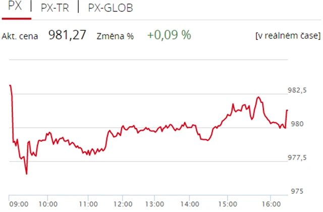 Pražská burza v pondělí navázala na plusový závěr minulého týdne, když index PX zpevnil o 0,09 % na 981,27 bodu. Nahoru burzu táhli telefonní operátor O2 Czech Republic, mediální společnost CME a pojišťovna VIG, nedařilo se naopak tabákové firmě Philip Morris ČR. Objem obchodů byl s 253 miliony Kč výrazně podprůměrný.