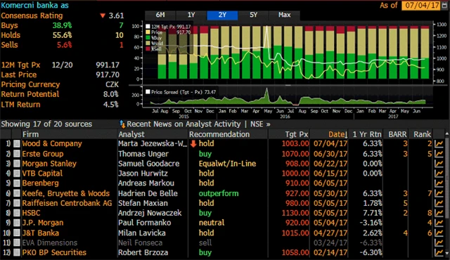Analytici investiční společnosti Wood & Company snížili doporučení na akcie Komerční banky na "hold" z "buy", jejich cílovou cenu však zvýšili z 999 na 1 003 Kč.