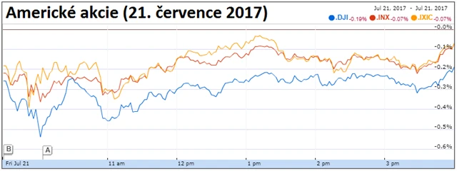 Index Dow v pátek klesl o 0,15 % na 21 580,07 bodu, širší index S&P 500 se snížil o 0,04 % na 2 472,54 bodu a index technologického trhu Nasdaq Composite sestoupil o 0,04 % na 6 387,75 bodu. Index volatility VIX klesl o 2,3 % na 9,36 bodu a výnos 10letých vládních dluhopisů USA se snížil o zhruba dva bazické body na 2,236 %.
