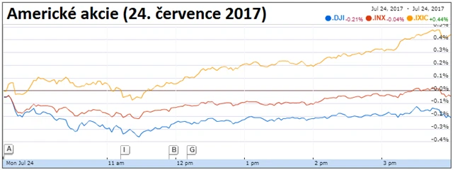 - Výsledky Alphabet v 2Q: Zisk na akcii 5,01 USD (odhad: 4,44 USD, loni: 7,00 USD), tržby 26 miliard USA (odhad: 20,8 miliardy USD, loni: 21,5 miliardy USD). Akcie v pondělním after-marketu -3 %.