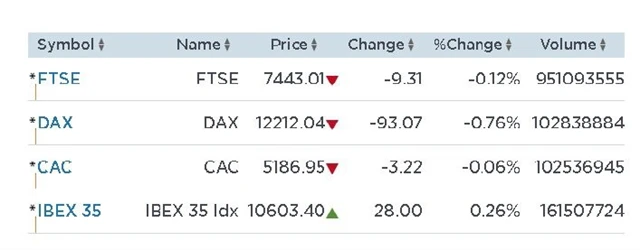 Celoevropský akciový index STOXX Europe 600 skončil na hodnotě 382,32 bodu se ztrátu 0,42 bodu, tedy 0,11 procenta. V červených čísech skončila většina jeho sektorů a s nimi i hlavní evropské burzy: index londýnské burzy FTSE 100 ztratil 0,12 procenta a německý DAX odepsal 0,76 procenta, zatímco francouzský CAC 40 si pohoršil jen nepatrně, o 0,06 procenta.