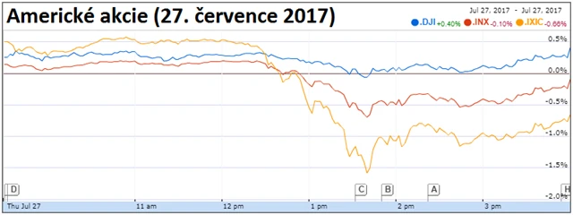 Dow posílil o 0,39 % na nové zavírací maximum 21 796,55 bodu, širší index S&P 500 klesl o 0,1 % na 2 475,42 bodu a index technologického trhu Nasdaq Composite se snížil o 0,63 % na 6 382,19 bodu. Všechny tři indexy během dne posunuly svá absolutní maxima - Dow na 21 798,47 bodu, S&P 500 na 2 484,04 bodu a Nasdaq Composite na 6 460,84 bodu.