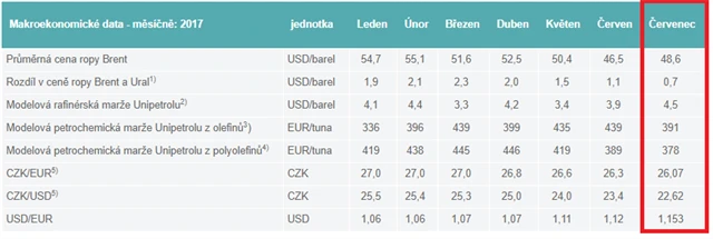 Petrochemický holding Unipetrol zveřejnil modelové marže za červenec. V rafinérském segmentu se marže zvýšila z 3,9 USD na barel na 4,5 USD. Rozdíl mezi cenami ropy Brent a Ural klesl z 1,10 USD na 0,70 USD na barel. Olefinová marže dosáhla v červenci 391 eur na tunu (červen: 439 eur) a polyolefinová marže byla 378 eur na tunu (červen: 389 eur).