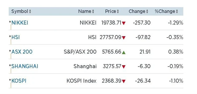 Hlavní index tokijské burzy Nikkei 225 i korejský index Kospi ztratily více než jedno procento. Index Hang Seng hongkongské burzy ztratil čtvrt procenta a trhy pevninské Číny zakončily seanci smíšeně. Poze index australské burzy ASX 200 si polepšil o 0,38 procenta, když čerpal oporu v subindexu silného finančního sektoru.