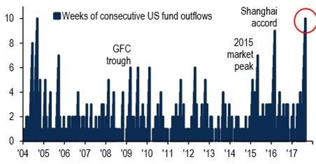 Podle akciového reportu Bank of America Merrill Lynch ze závěru minulého týdne investoři zanevřeli na americké akcie. Během posledních deseti týdnů z amerických akcií odteklo zhruba 30 miliard USD, což je nejdelší série odlivu kapitálu od roku 2004. Svou pozornost investoři místo toho zaměřili na evropské a japonské akcie a rozvíjející se trhy, do kterých ve stejném období přiteklo celkem 36 miliard USD.
